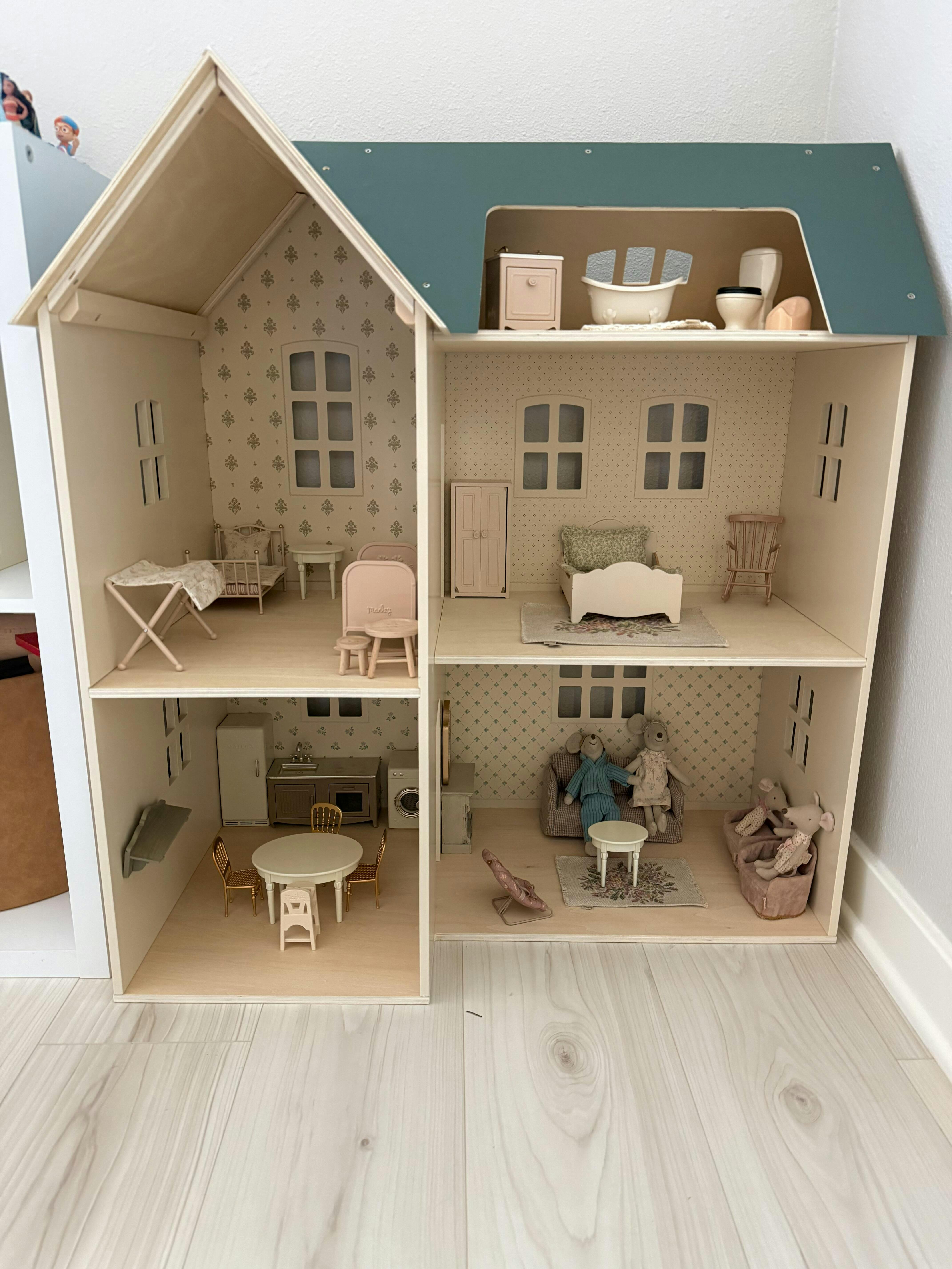 Such a pretty, classic dollhouse, the mouse size also fit just fine and doesn’t look too small in it. My girls are obsessed, we love Maileg sm!